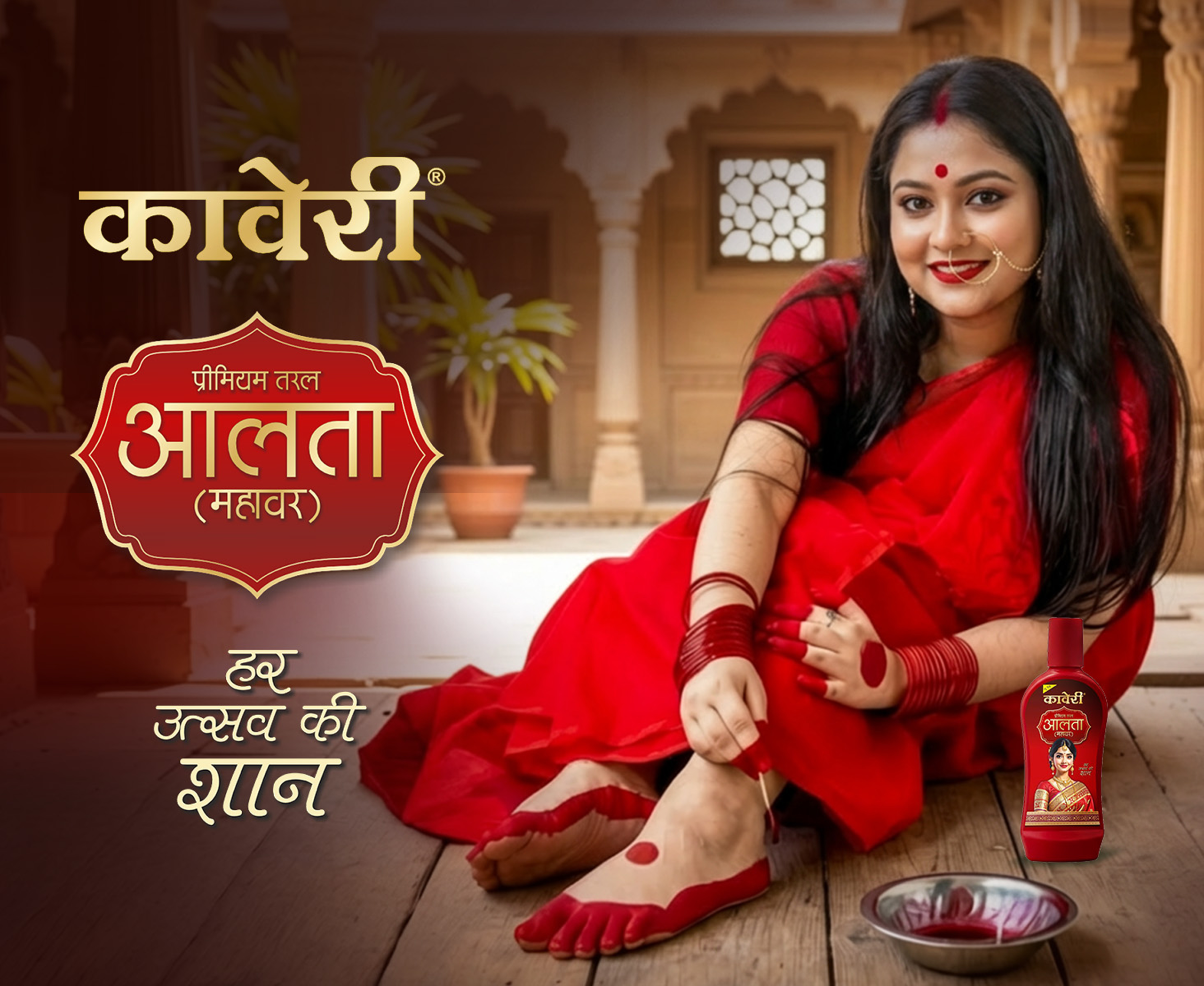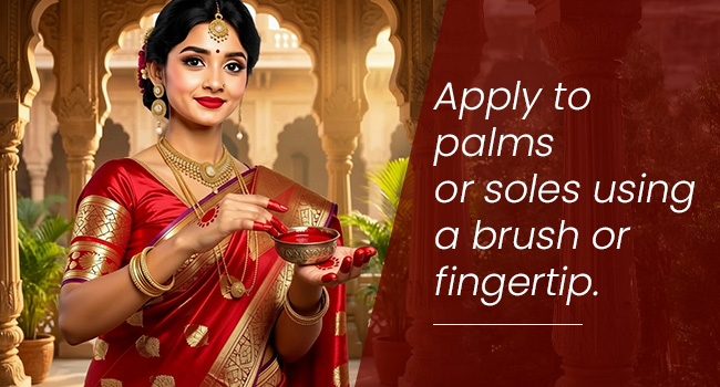 Kaveri Liquid Alta is used for decorating hands and feet in traditional Indian practices. It is commonly applied during weddings, festivals, puja rituals, and classical dance performances like Bharatanatyam.