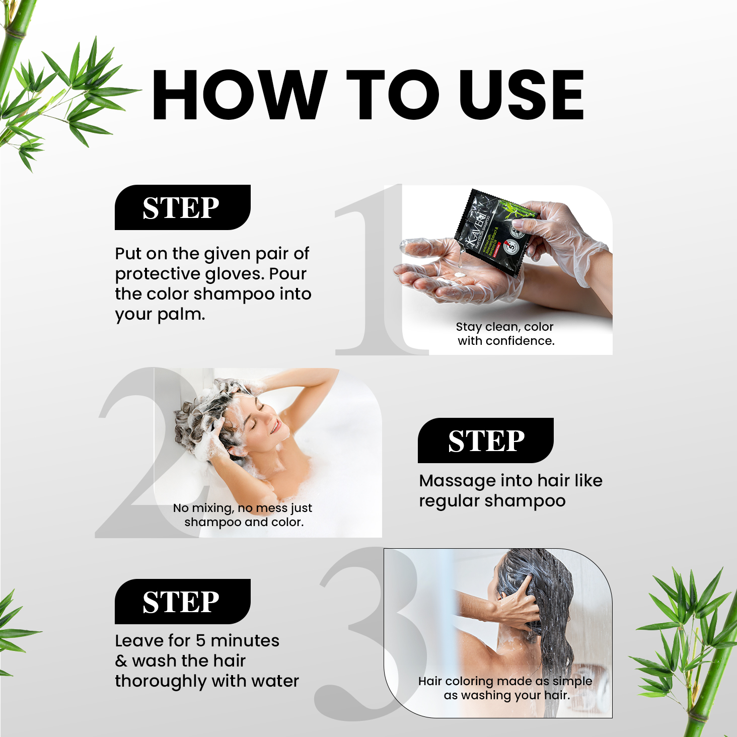- Leave for 5 minutes & wash the hair thoroughly.