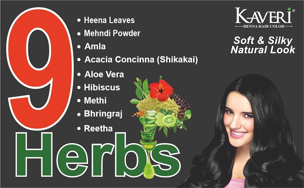 • Kaveri Henna Hair Color is enriched with the goodness of 9 vital herbs such like: Henna Leaves, Mehendi Powder, Amla, Acacia Concinna (Shikakai), Hibiscus , Aloe Vera , Methi, Bhringraj. When it comes to hair care, henna is one of the most popular ingredients.
