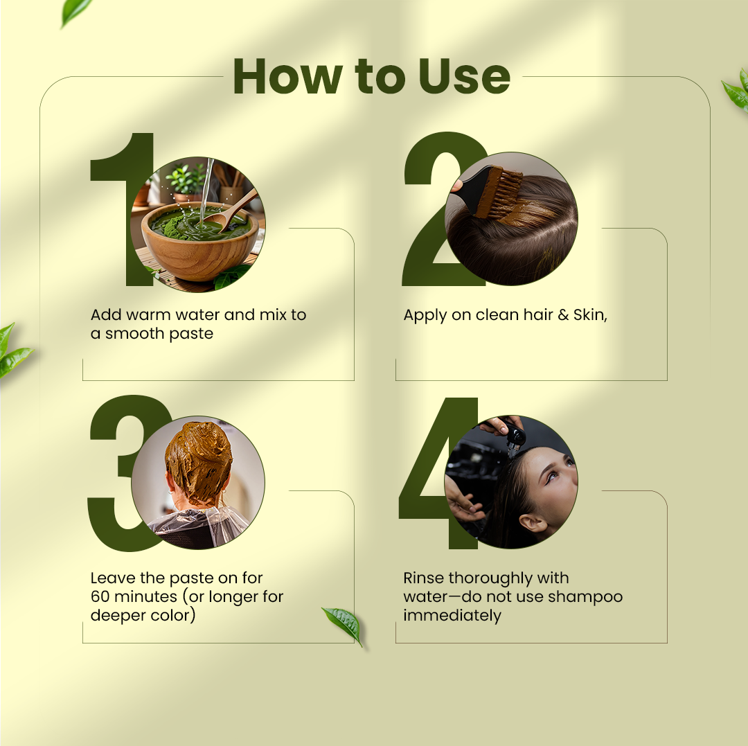 - Easy To Use – Mix kaveri mehendi powder with water in a non-metallic bowl. Apply on your hair or for design on hand & feet. Leave it for 1-2 hours. Wash thoroughly with clean water.