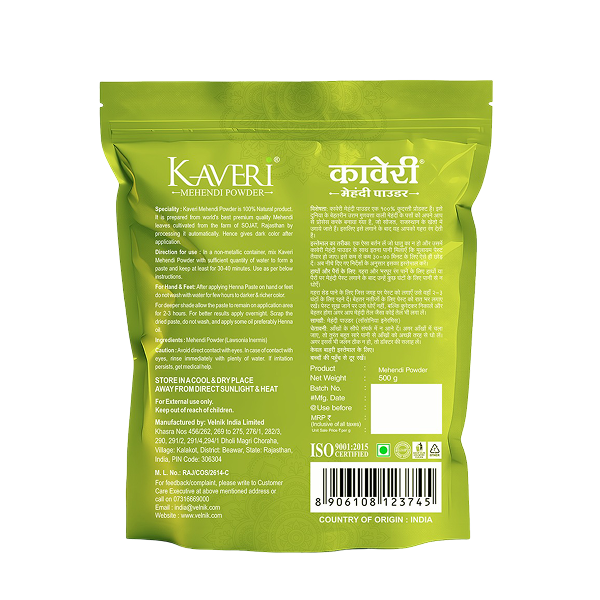 - 100% Herbal Henna & No chemicals – Kaveri Mehendi Powder is 100% natural & herbal mehendi powder, prepared from premium quality Henna leaves. Kaveri Mehendi Powder is being processed in our manufacturing unit, with stringent care and gone through with various quality check process and checked on different quality parameters in order to keep up the richness of Kaveri Brand.